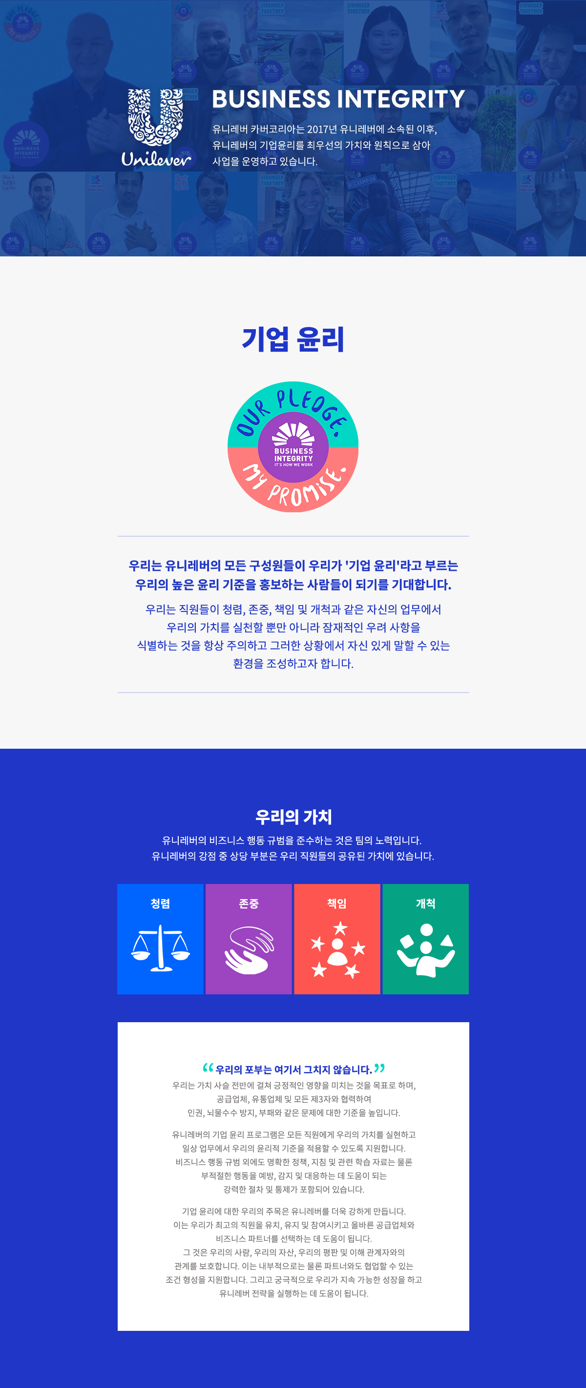 청렴은 우리가 어디에 있든 어떻게 행동해야 하는지 정의합니다. 이는 우리가 유니레버의 장기적인 성공을 위해 올바른 일을 하도록 안내합니다. 이 웹사이트와 연례 보고서에 제공된 정보 외에도 우리는 UN 글로벌 콤팩트와의 연례 커뮤니케이션을 통해 부패 방지 프로그램의 현황을 공개적으로 보고합니다.
