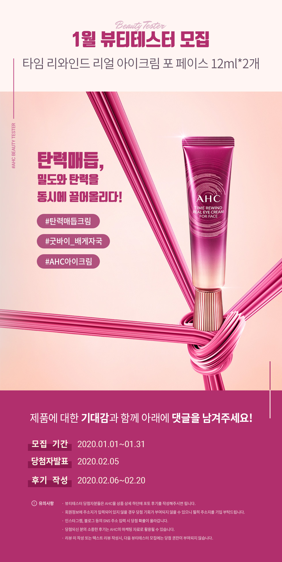 1월 뷰티테스터 모집 2020.01.01 ~ 2020.01.31 공유하기 상품보기 0 / 1500 댓글등록 사진첨부 댓글 개 등록된 댓글이 없습니다. 다른 진행중인 이벤트 [이벤트]AHC 카카오 채널 친구 추가 시 5,000원 쿠폰 2026.01.05 ~ 2026.12.31 목록